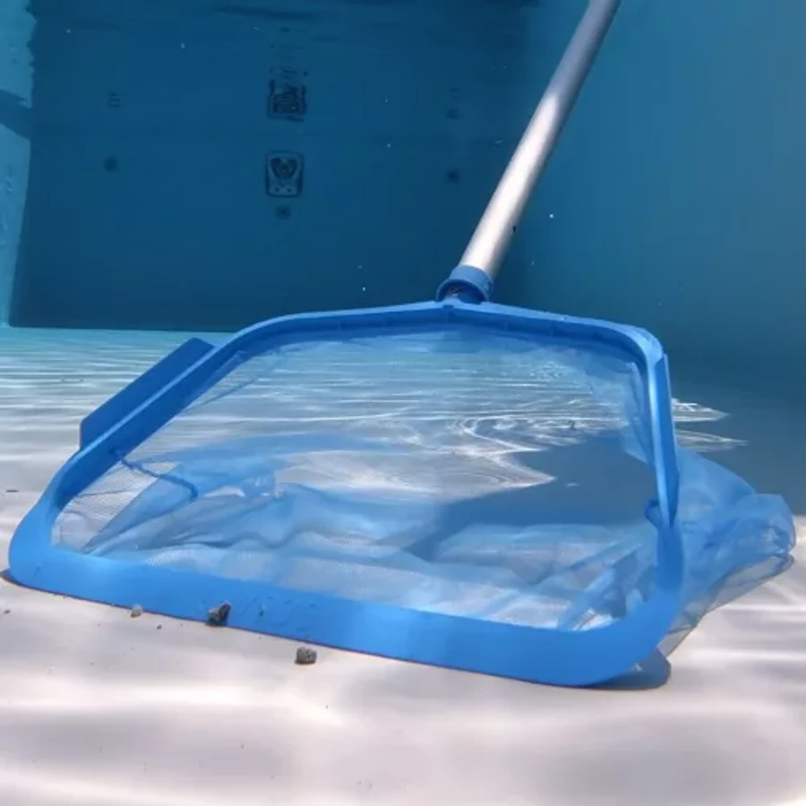 Teleszkópos rúdhoz csatlakoztatható, medence felszínén lebegő szennyeződések eltávolítására szolgáló eszköz.