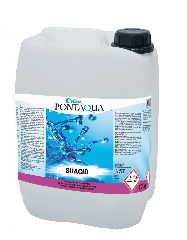 Alkalmazás: Ha a pH-érték 7,6-nál magasabb, adagoljunk a fürdőmedencevízhez SUACID-ot. Magas pH érték esetén a klórozószer nem fejti ki fertőtlenítő hatását, ezért a medence vize bezavarosodik, bealgásodik. Oldat készítésekor előbb mindig vizet töltsünk az edénybe, majd azután lassan keverés mellett a vegyszert, sohasem fordítva! Hígításkor az oldat erősen melegszik. Közvetlenül a tárolóedényből adagolószivattyúval adagolható. Magas koncentrációjú, ezért igen gazdaságos. 1 kg SUACID hatása több mint 1,5 kg sósav hatásával azonos. Teljesen kloridmentes, ezért nem korrozív.